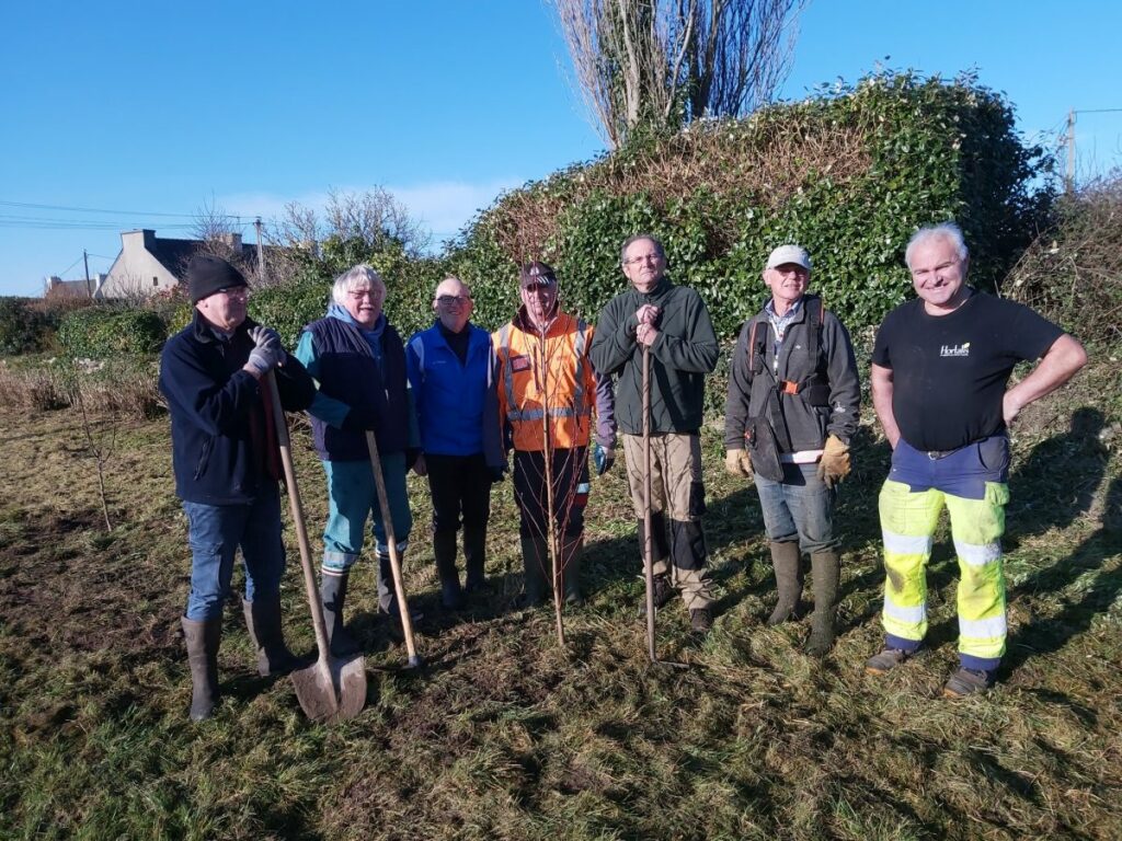 Mardi dernier l’équipe de 14 bénévoles s’est scindée en deux pour d’un coté planter des arbres fruitiers à Kerazan et de l’autre dégager des arbres en travers d’un chemin communal à Porz-Bizhinog à quelques mètres du GR 34.