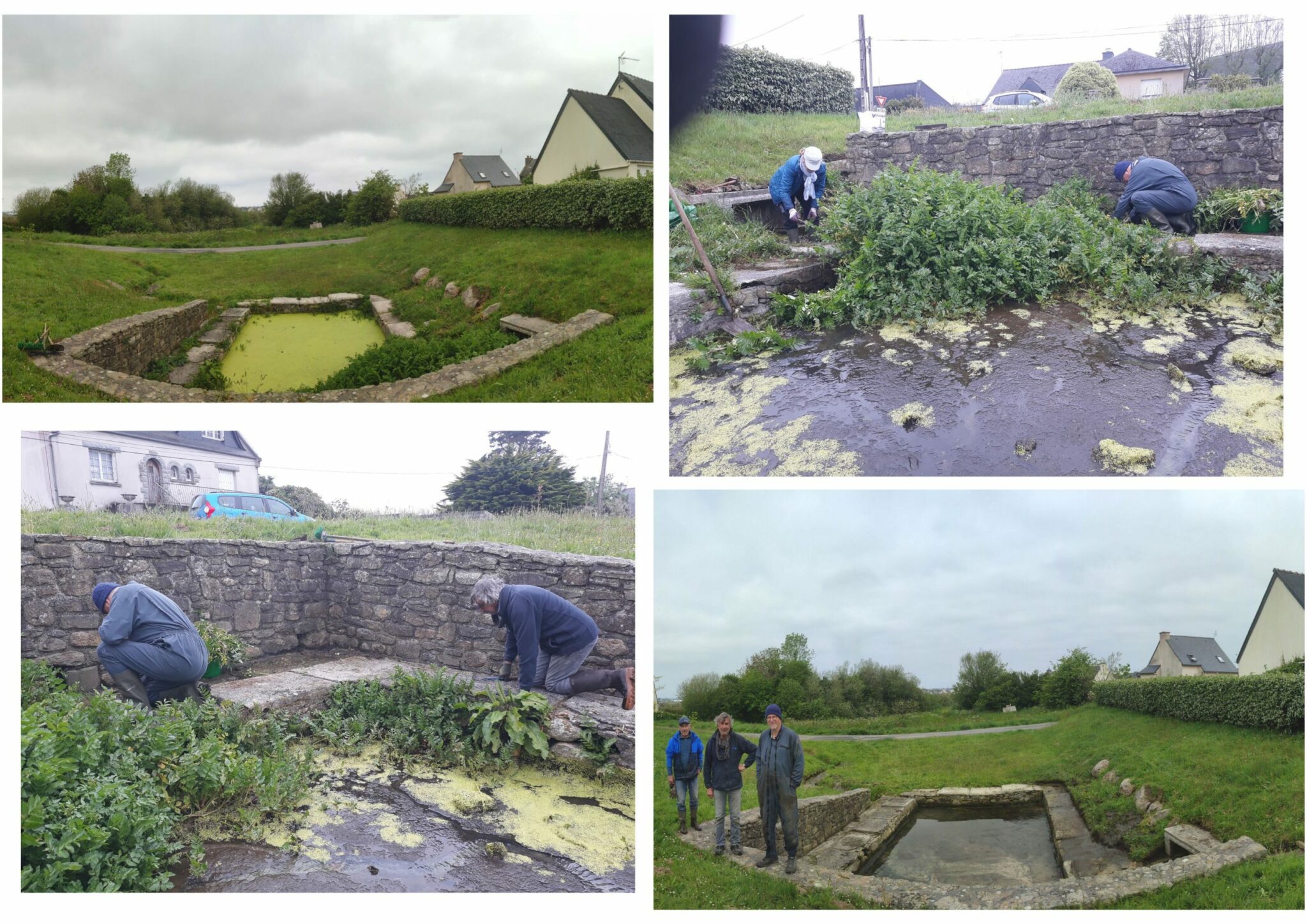 Sur l’autre chantier, au lavoir de Kervenn, selon Martine : « Un lavoir qui semblait simple mais qui nous a tout de même donné du fil à retordre… Nous avons même dû reconstruire un petit muret 😉 Pierre,Michel, François et Martine ont relevé le défi avec brio 🤣 ».
