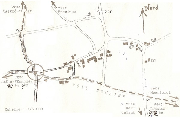 Il faut donc chercher autre chose… Sur l’importante voie romaine on trouve une croix qui, comme de nombreuses autres, est une croix de carrefour. Ce carrefour concerne la route qui va en direction de CARHAIX la route qui vient en direction de Plouguerneau et qui se poursuit sur St Cava d’une part et un embranchement se dirigeant vers Castel-al-lez (traduit par « poste fortifié » (castellum) de la bordure ou d’en haut (Lez ou Laez) du pays pagan.
