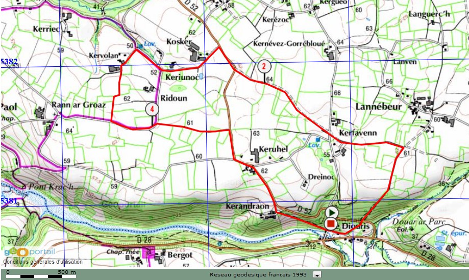 Départ et retour départ du moulin du Diouris (croisement de 4 communes : Plouvien, Kernilis, Lannilis et Plouguerneau) sur la D 28 entre Lannilis et Kernilis.