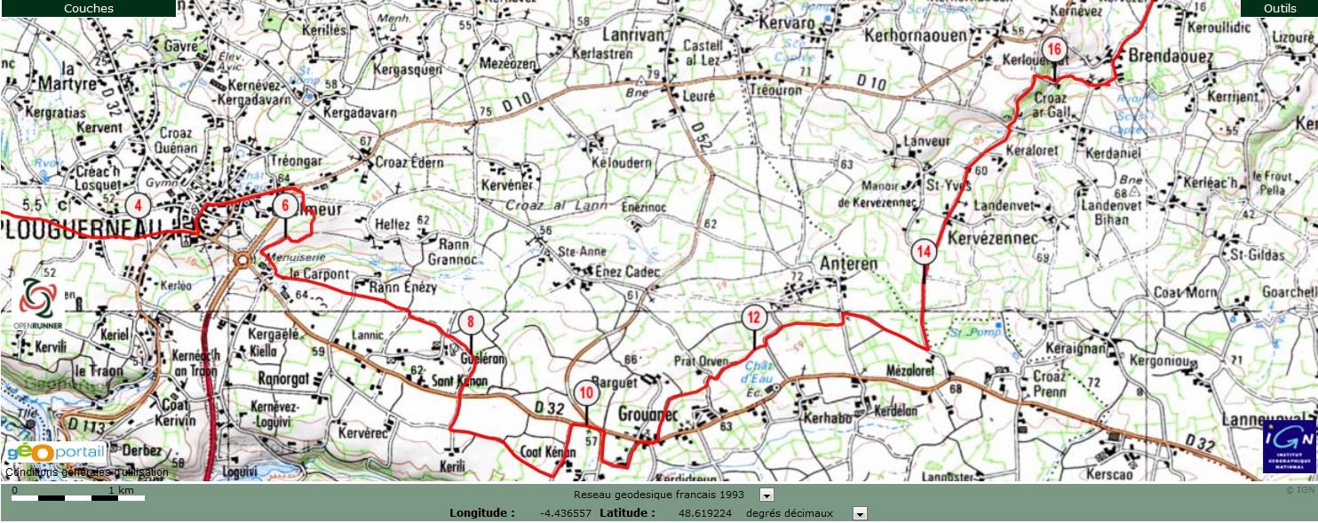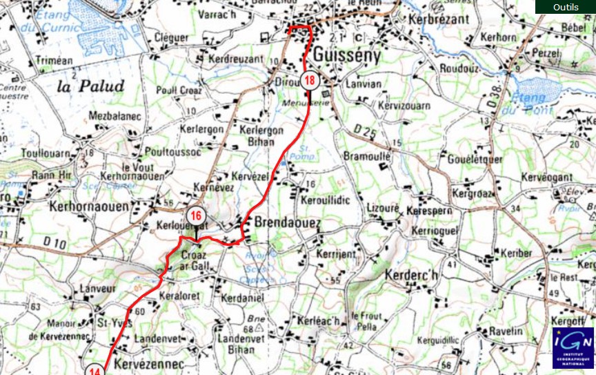 Arrivéau lieu-dit : Kerili, une chapelle privée se trouve sous le lierre dans le champs en face). prendre le chemin sur la gauche afin d’arriver sur une route au lieu-dit : Koat-Kenan. tourner à gauche par la route jusqu’à la (D32) un peu plus loin. au stop, tourner à droite, puis encore à droite vers la direction du Diouris/Plouvien sur 100m. tourner à gauche lieu-dit : Porz al Lez, pour arriver dans un petit chemin qui ramènera sur la (D32). tourner à droite par le trottoir afin d’arriver au parking du Grouanec (P9), la chapelle du Grouaneg se trouve côté gauche. Grouanec / Guisseny Du parking du bourg du Grouanec : (P9).