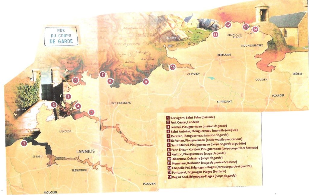 On y repère le fort Cézon (environ 40 hommes et jusqu’à 100 hommes, 5 canons ou plus), des batteries (Korejou, Pontusval, un peu plus de 20 hommes pour chacune et deux à trois canons), des maisons de garde. Cependant, comme le confirme les annotations relatives à la seconde carte de 1734, tous les ouvrages de défense ne sont pas opérationnels. En période de paix certains se détériorent, et, la guerre reprenant, force est de constater les carences du dispositif militaire.Au fil du temps les canons ont été déplacés et demeurent introuvables. Les miliciens reçoivent parfois l’appui des troupes du roi de Brest et en particulier celui des canonniers de métier. Les communications entre les points fortifiés se réalisent par pavillons, par feux et par un code de fumée. D’où le rôle important du garde-pavillon lequel doit être apte à entrer en contact avec ses collègues placés sur le littoral, mais également avec les navires en mer.