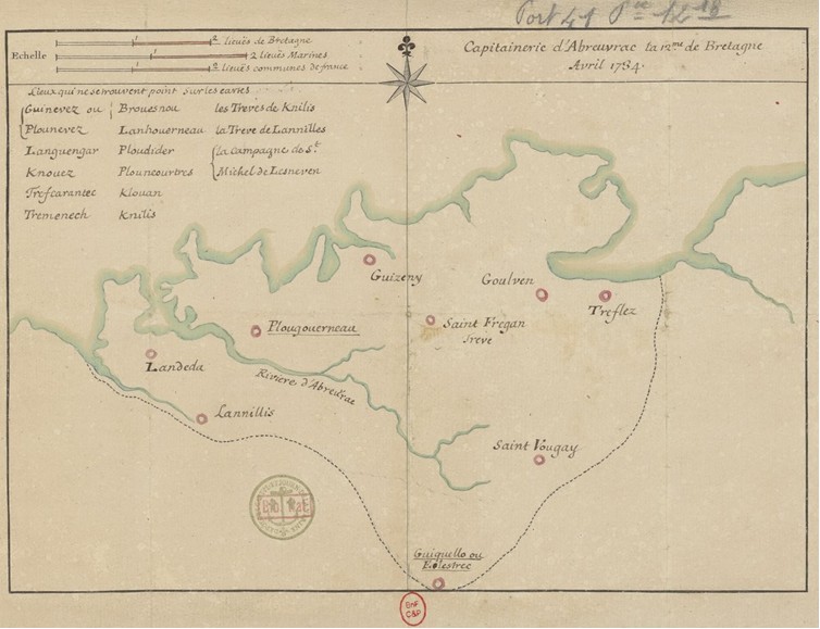 Le premier est daté d’avril 1734. Il se présente sous la forme d’un « projet de carte pour la capitainerie de l’Abrewac, la douzième de la Province de Bretagne ». Le rédacteur s’adresse « aux personnes intelligentes de la Province (pour) ajouter la position des lieux qu’on a pas trouvés dans les cartes : savoir Guinevez ou Plounevez , Languengar, Knouez, Trémenech, Brouesnou, Plounéour-Tres, Kerlouan, Knilis… ». Il semble que le contour de la capitainerie n’est pas définitif et changerait si certains lieux cités « ne s’y trouvent pas enfermés ». Leur position devra être vérifiée ainsi que les distances entre eux (selon l’échelle placée en haut du document par lieues de Bretagne, de France, marine). Effectivement, les emplacements de Saint-Vougay et de Guiquello sont à revoir. Il rajoute « qu’il faudrait marquer le nombre et la situation des corps de garde avec les batteries qui se trouvent le long de la côte en distinguant les corps de garde aussi bien que les batteries qui peuvent être ruinés ». Pour affiner la localisation des lieux « il conviendrait d’ajouter les noms des rivières ou des ruisseaux ». Il demande un soin particulier au trait ou dessin du littoral. Il aimerait qu’on lui communique d’autres cartes existantes sur ce secteur pour compléter ses informations.