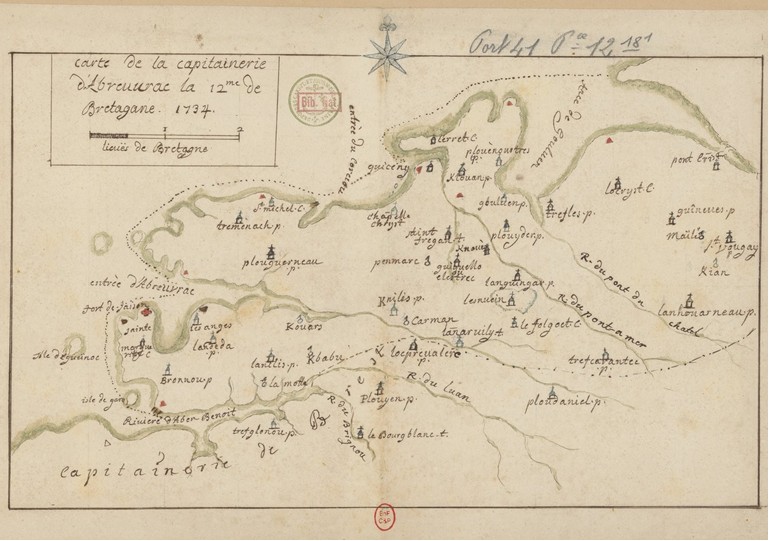 Les documents (deux cartes ci-dessous et deux textes) m’ont été communiqués par Bernard Le Bec de l’association Patrimoine des Abers de Landéda. Ils proviennent de la Bibliothèque nationale de France (site Gallica). Les textes, non reproduits ici, permettent d’éclairer l’interprétation des deux documents.