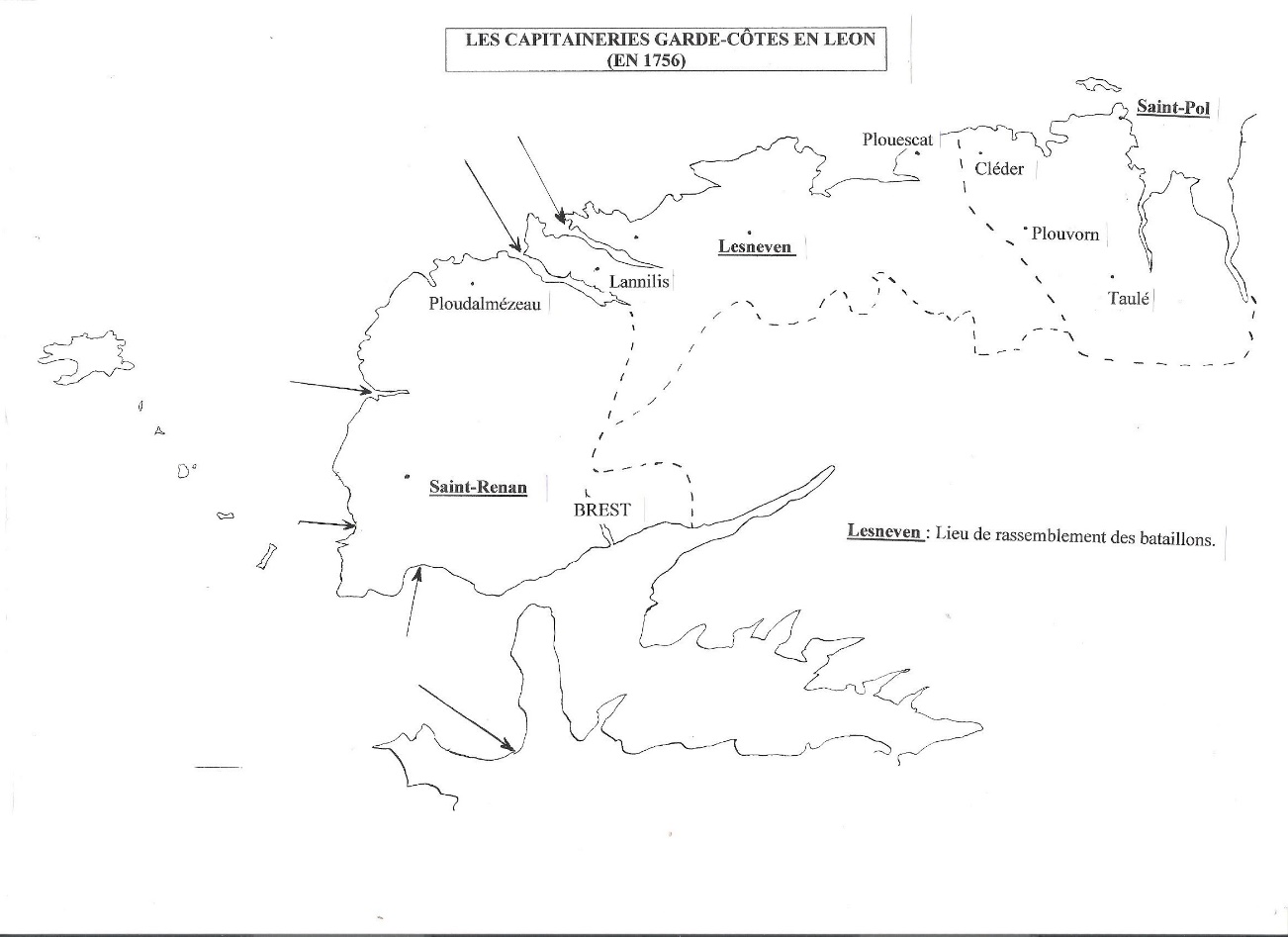 La carte de 1756 fixe les limites de la capitainerie de Lesneven/l’Abreuwrac et les flèches indiquent les secteurs à défendre en priorité pour éviter la pénétration ennemie et les menaces sur Brest.