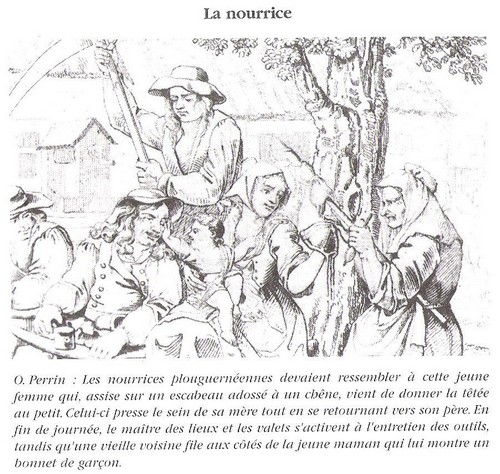 L’allaitement par la mère est la règle dans les campagnes, c’est à dire dans l’immense majorité des familles. La sagesse populaire y voit le prolongement naturel de la grossesse et l’acte maternel par excellence. Au XVIIIe siècle, en ville, la pratique de l’allaitement par autrui et de la mise en nourrice du nouveau-né tend à se généraliser dans toutes les classes de la société urbaine française. En Bretagne, le phénomène est identique et certaines paroisses comme Milizac ou Landévennec en font une sinistre spécialité (de 1670 à 1715, une centaine d’enfants décèdent dans la première, de 1678 à 1788, un millier dans la seconde). A Plouguerneau et à Tréménac’h plus de soixante-dix petits entrent dans cette catégorie de 1747 à 1790.
