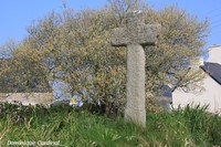 Cette croix monolithe à huit pans a déménagé de quelques mètres. Ces quelques mètres ont suffit à la faire changer de quartier. Elle était, autrefois sur le sol de Poulskao. |