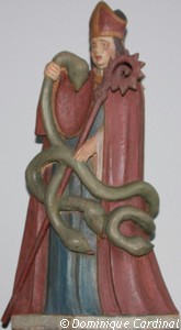 Dans la collection des Petits Saints de Plouguerneau, la statuette de St Patrick ,qui fut offerte en 1953 à la paroisse par Monsieur de Poulpiquet aprés la naissance de son fils, est revêtue des vêtements épiscopaux . Le saint tient sa crosse de la main gauche. De la main droite, il serre l’une des quatre têtes d’un énorme serpent, symbolisant sans doute toutes les difficultés et tous les dangers qu’il a eu à surmonter dans l’accomplissement de sa mission.