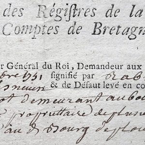 Le document daté du 20 septembre 1752 est extrait des registres de la Chambre des Comptes de Bretagne. Certes, cette quittance ne bouleversera pas l’histoire de Plouguerneau, Il s’agit simplement de rappeler au Sieur Ollivier Le Got, demeurant au bourg de Plouguerneau et propriétaire de plusieurs maisons nobles au bourg, qu’il doit régler des frais pour une assignation datant du 20 septembre précédent. En date du 11 juillet 1752, l’huissier Rabu, de Lesneven, réclame 30 Louis et 4 sols pour ces frais d’assignation mais aussi pour les frais liés à ce rappel. Le document imprimé et complété de manière manuscrite par l’huissier, n’indique malheureusement pas les raisons de cette assignation.